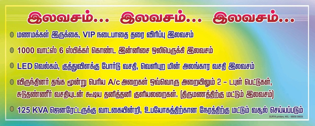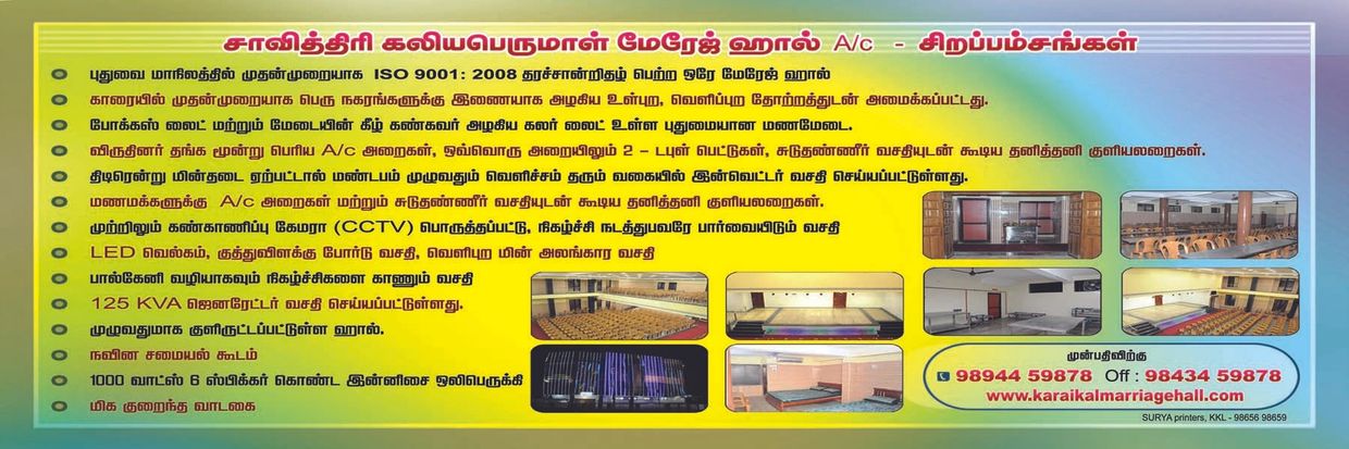 Ø First Time in Karaikal a Marriage hall with Beautiful Interior and Exterior design better than in Metro Cities.